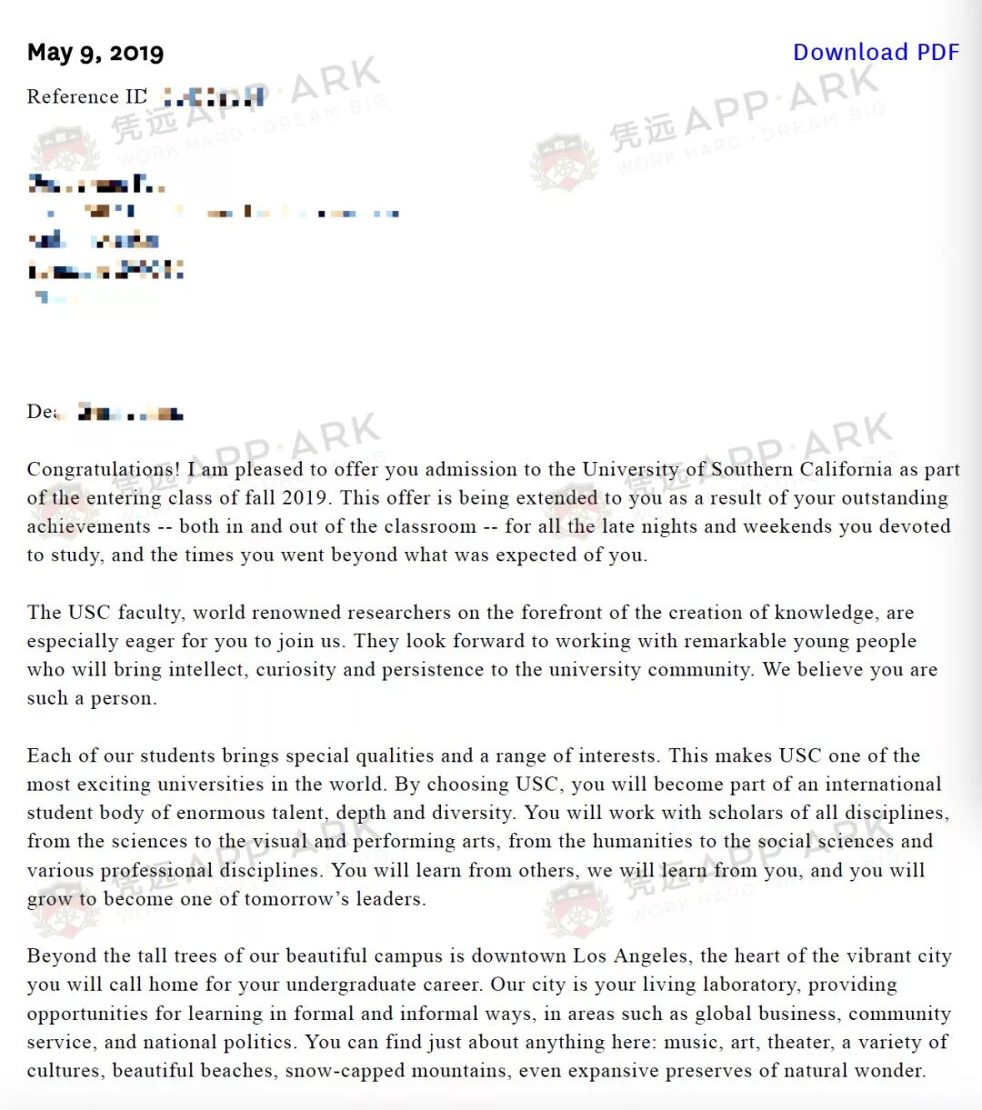 当我们进入到USC官网Portal上复查时,发现一封正式的录取信早在前一天,已经安静地躺在潘同学的账号里: